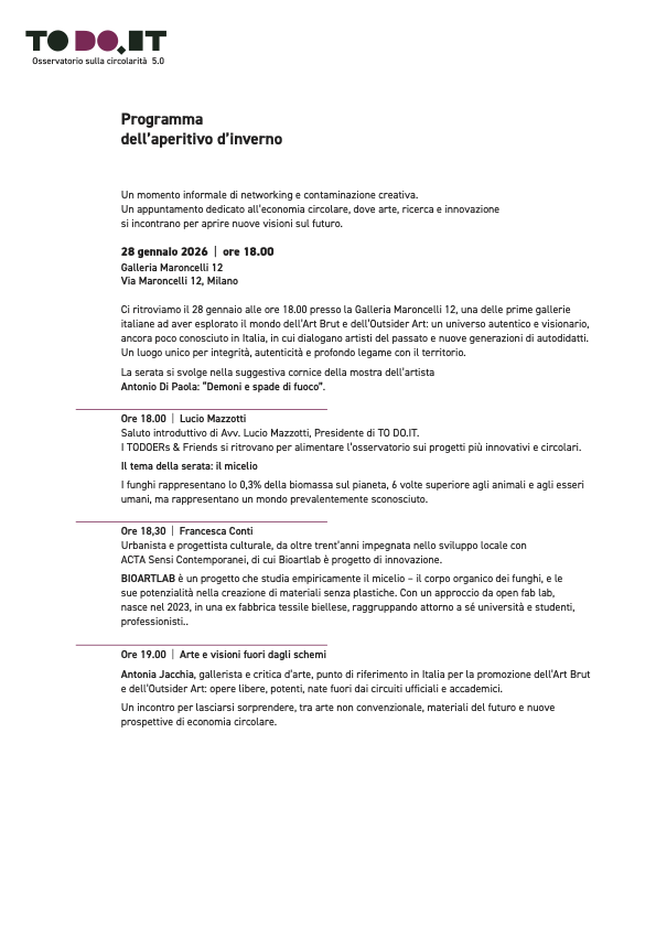 Un aperitivo d’inverno che è prima di tutto un incontro di idee. Un momento informale di networking e contaminazione creativa, dove arte, ricerca e innovazione si intrecciano per aprire nuove visioni sul futuro. In una cornice artistica d’eccezione, il dialogo si concentra sull’economia circolare e su materiali e linguaggi non convenzionali, tra sperimentazione, cultura e immaginazione.